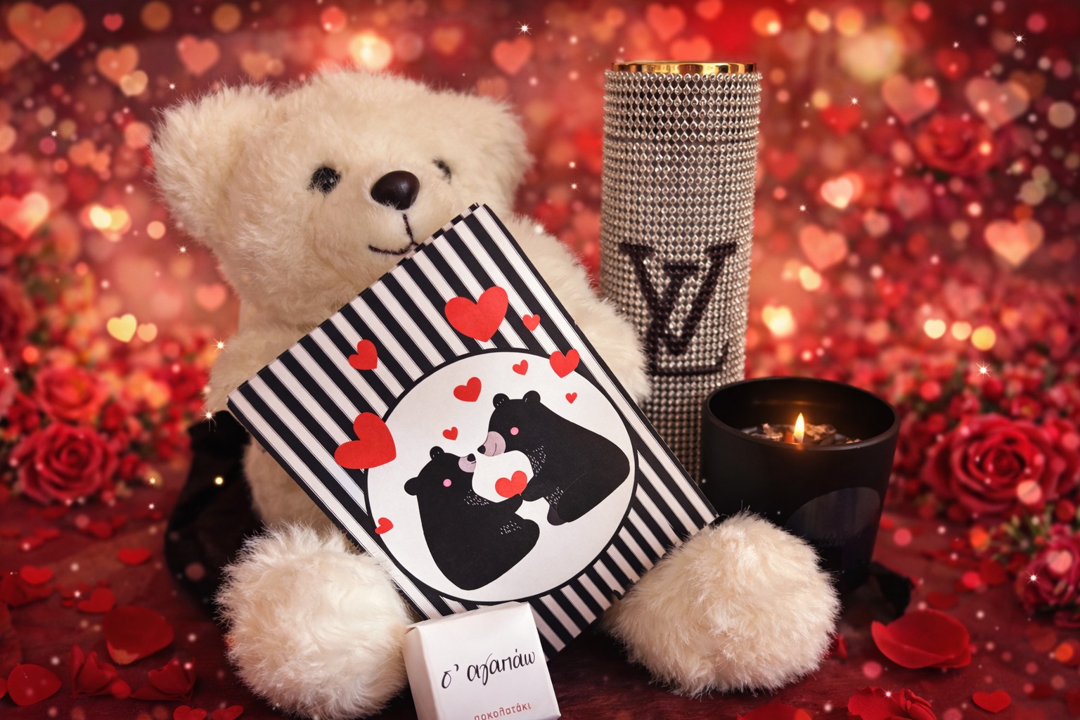 Μίνι κουτί έκπληξη ,περιλαμβάνει λευκό αρκουδάκι ,θερμός με λογότυπο LOUIS VUITTON ασημένιο χρώμα με στρας ,ρομαντική κάρτα για ευχές ,χειροποίητο κερί σόγιας και σοκολατάκι ΡΕΝΕ* με μήνυμα.