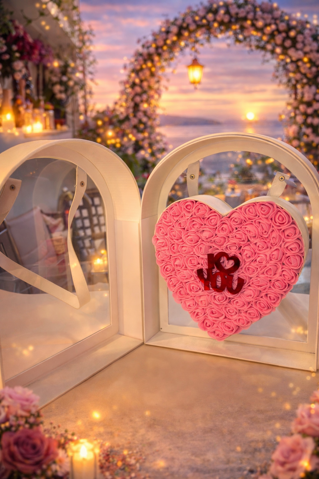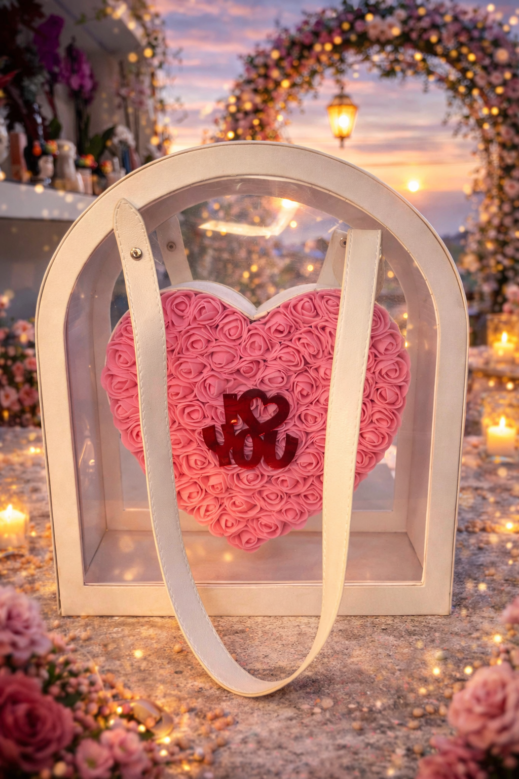 Τσάντα χειρός λευκή με εσωτερική καρδιά με μικρά foam ροζ τριαντάφυλλα που διαρκούν για πάντα & κόκκινο plexiglass I love you 🥰