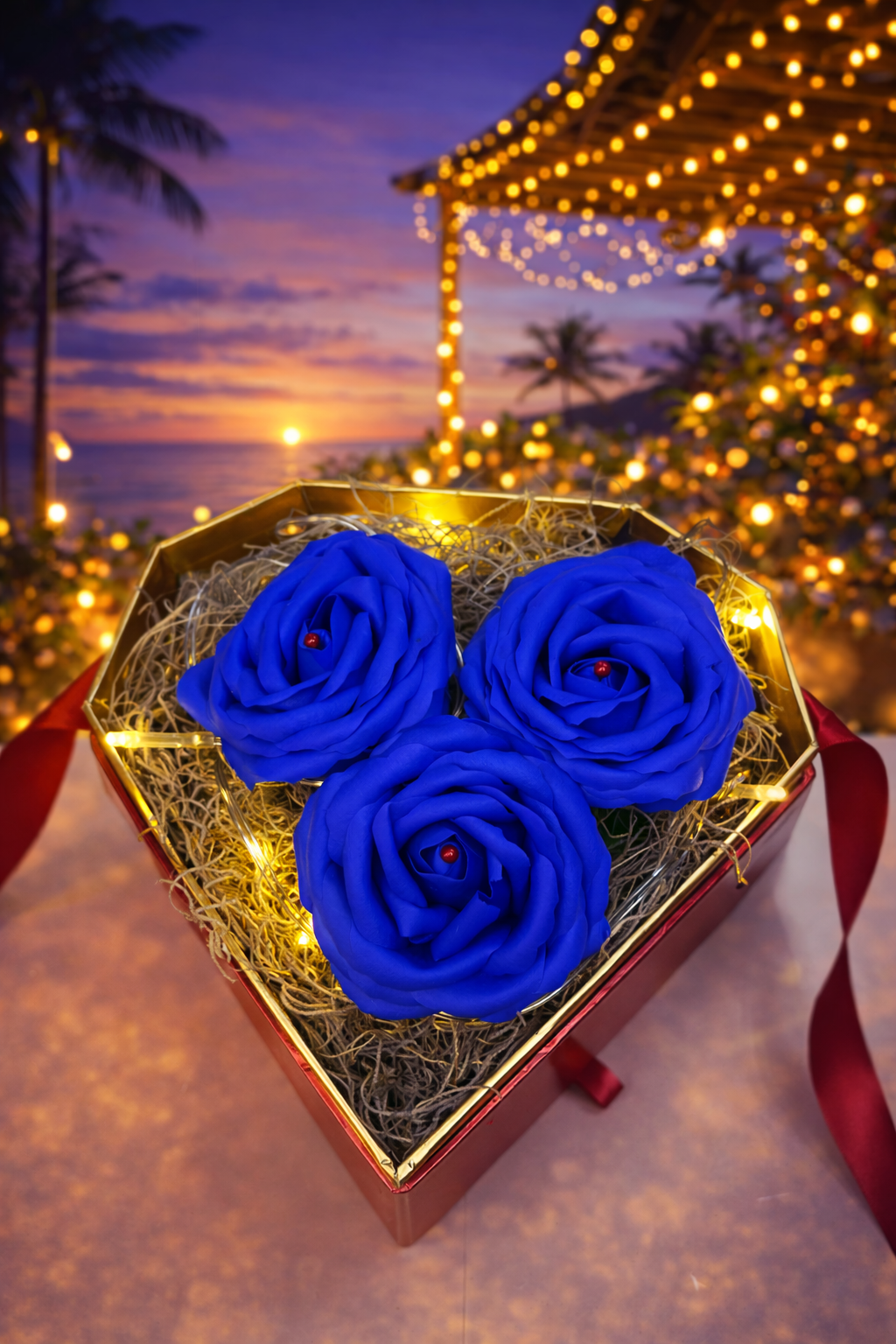Κουτί κόκκινο σε σχήμα διαμαντιού με πλέξιγκλας θολό με 3 μπλε αρωματικά σαπουνιού τριανταφυλλα με κόκκινη πέρλα στο κέντρο και φωτάκια λεντ .Περιλαμβάνει συλλεκτικό …