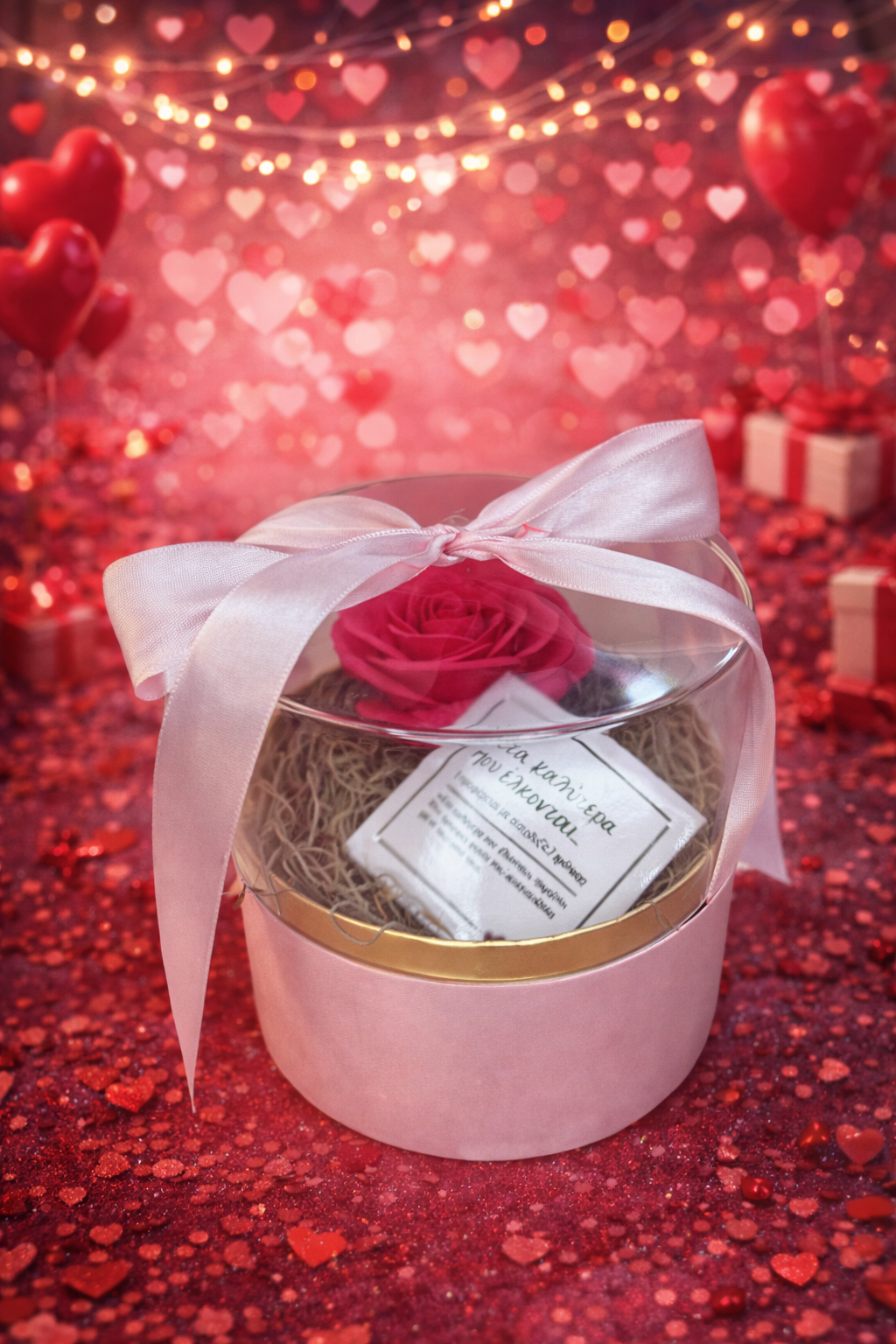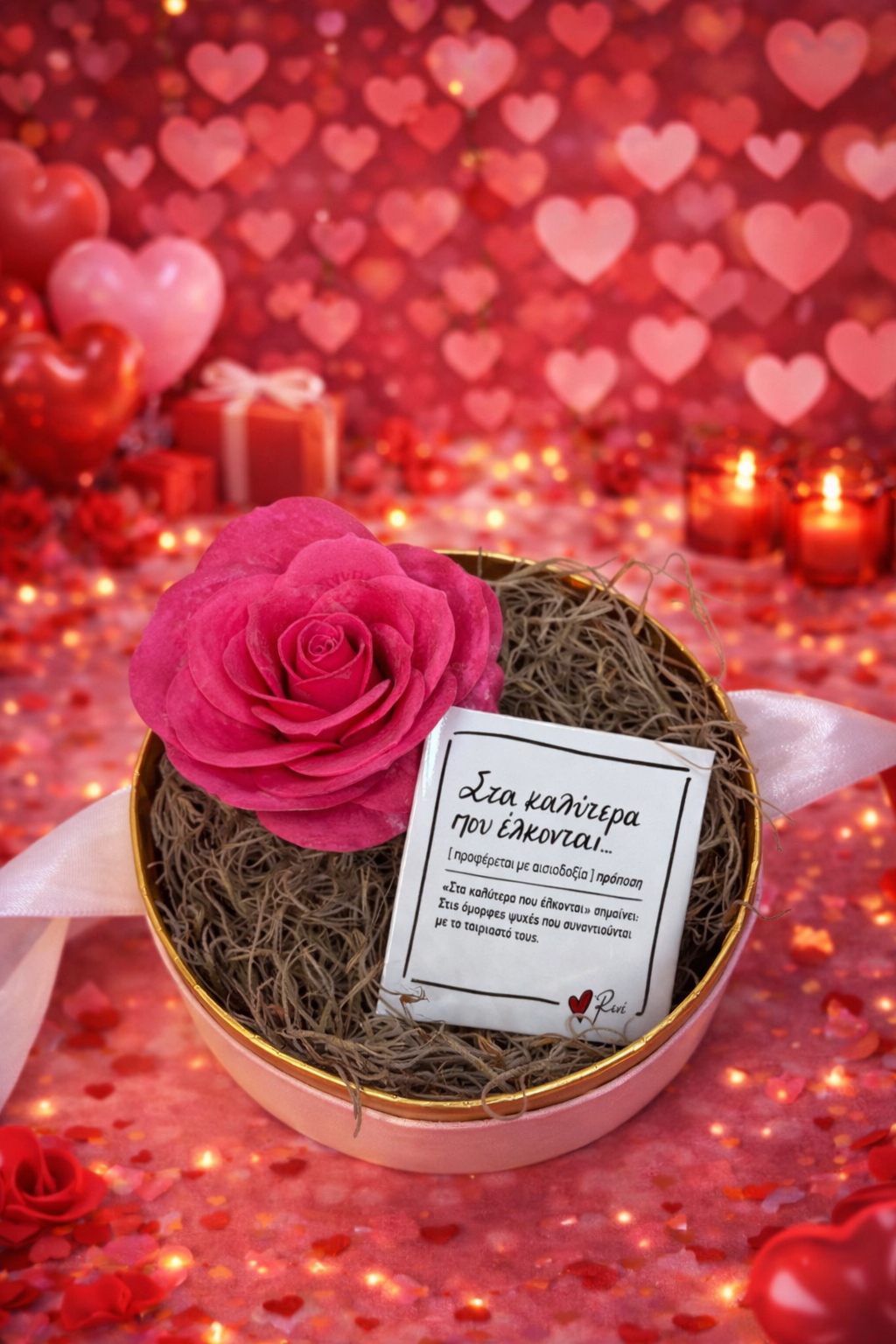 Υπέροχο ροζ κουτί με θόλο στρογγυλό ,περιλαμβάνει ένα αρωματικό τριαντάφυλλο σαπουνιού σε φούξια  χρώμα και ένα συλλεκτικό μαγνητάκι της ΡΕΝΕ στα καλύτερα που έλκονται