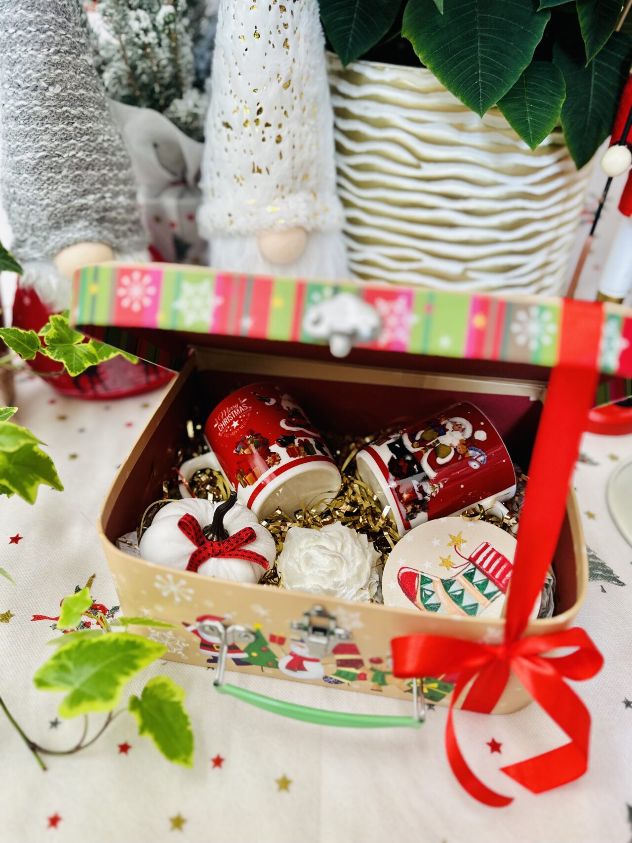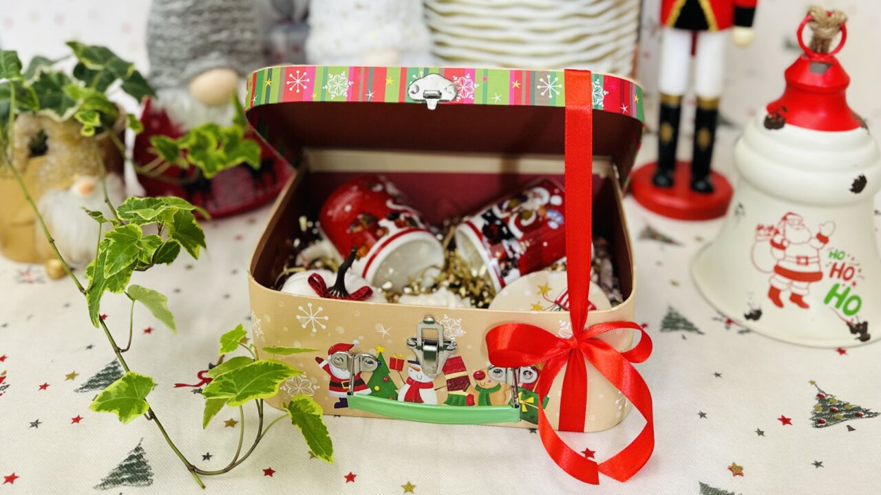 Το βαλιτσάκι έχει διαστάσεις 25 x 20 εκατοστά και περιλαμβάνει: 2 μικρές κούπες, 1 διακοσμητική κολοκύθα, 1 κερί σε σχήμα τριαντάφυλλο & 1 ξύλινο γαντζάκι – κρεμάστρα τοίχου.