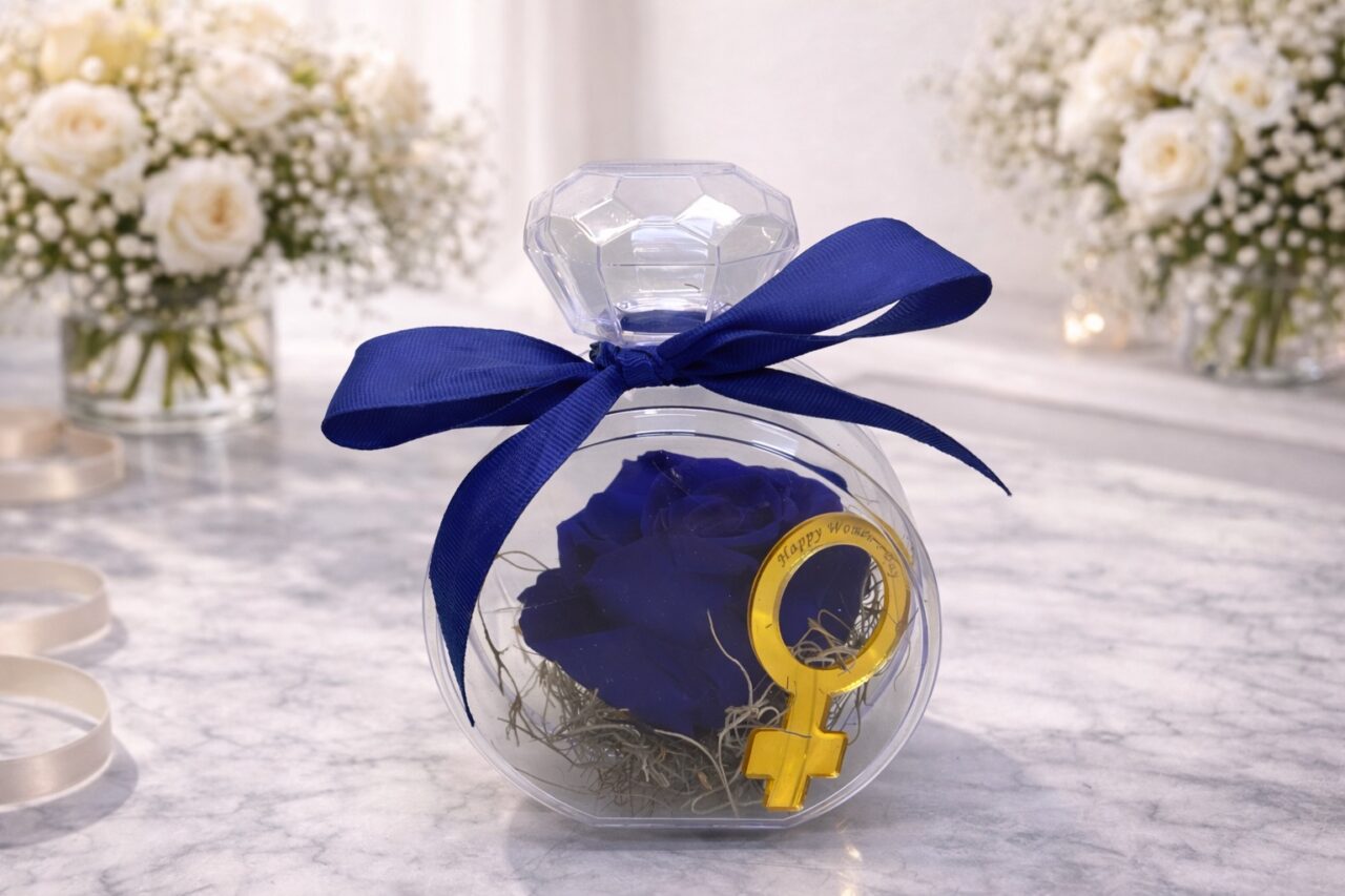 Μοναδικό forever rose μπλε χρώματος σε υπέροχο πλέξιγκλας σε σχήμα αρώματος.Περιλαμβάνει πλέξιγκλας σε χρυσό χρώμα που γράφει «happy women’s day»