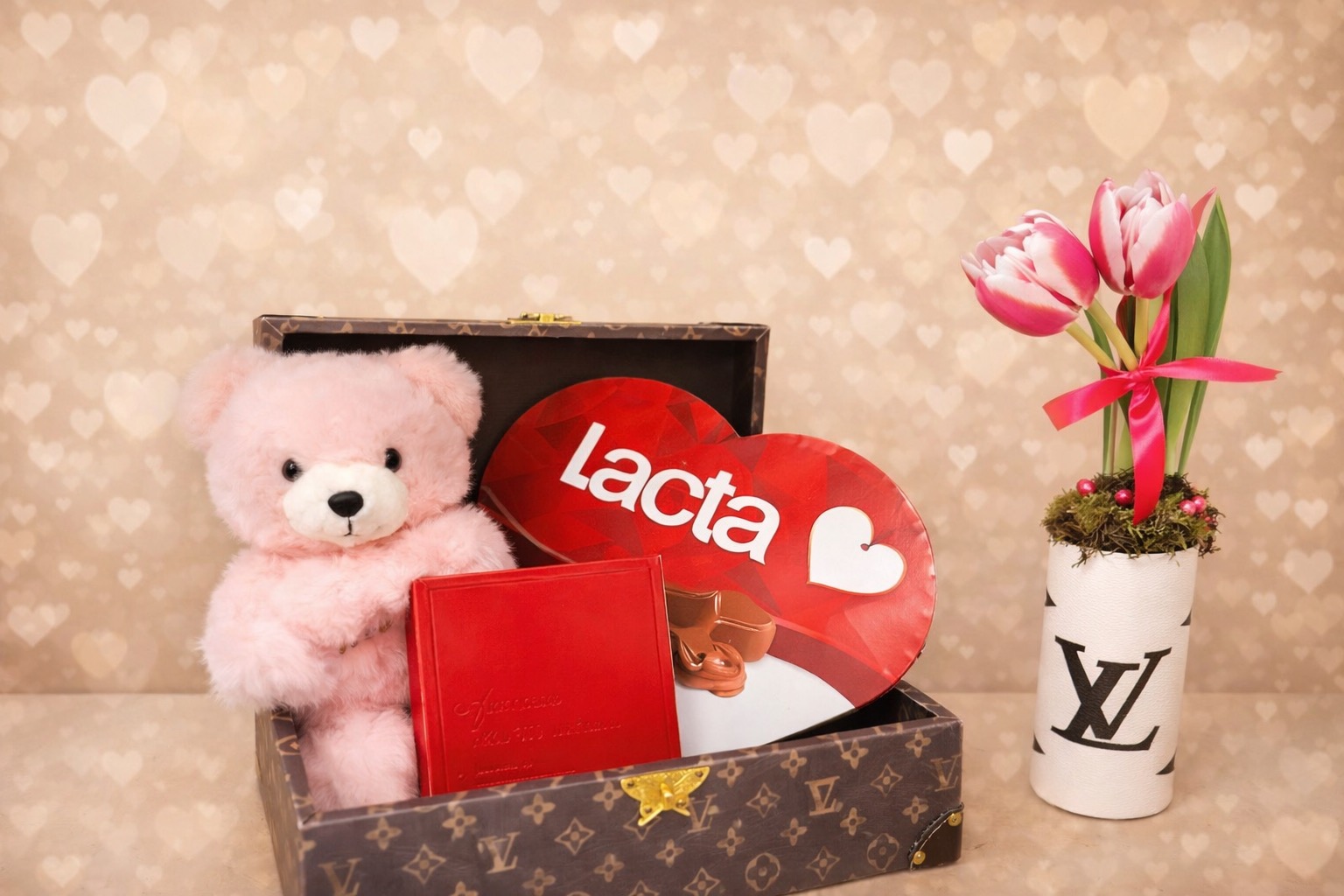 Μεσαίο κουτί Louis Vuitton το οποίο περιέχει αρκουδάκι*, κάρτα ΡΕΝΕ*, κουτί με σοκολατάκια lacta σε σχήμα καρδιάς και ιδιαίτερος θερμός Louis Vuitton με σύνθεση από τουλίπες.
