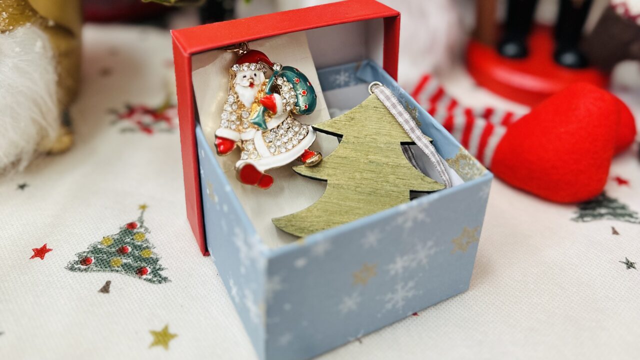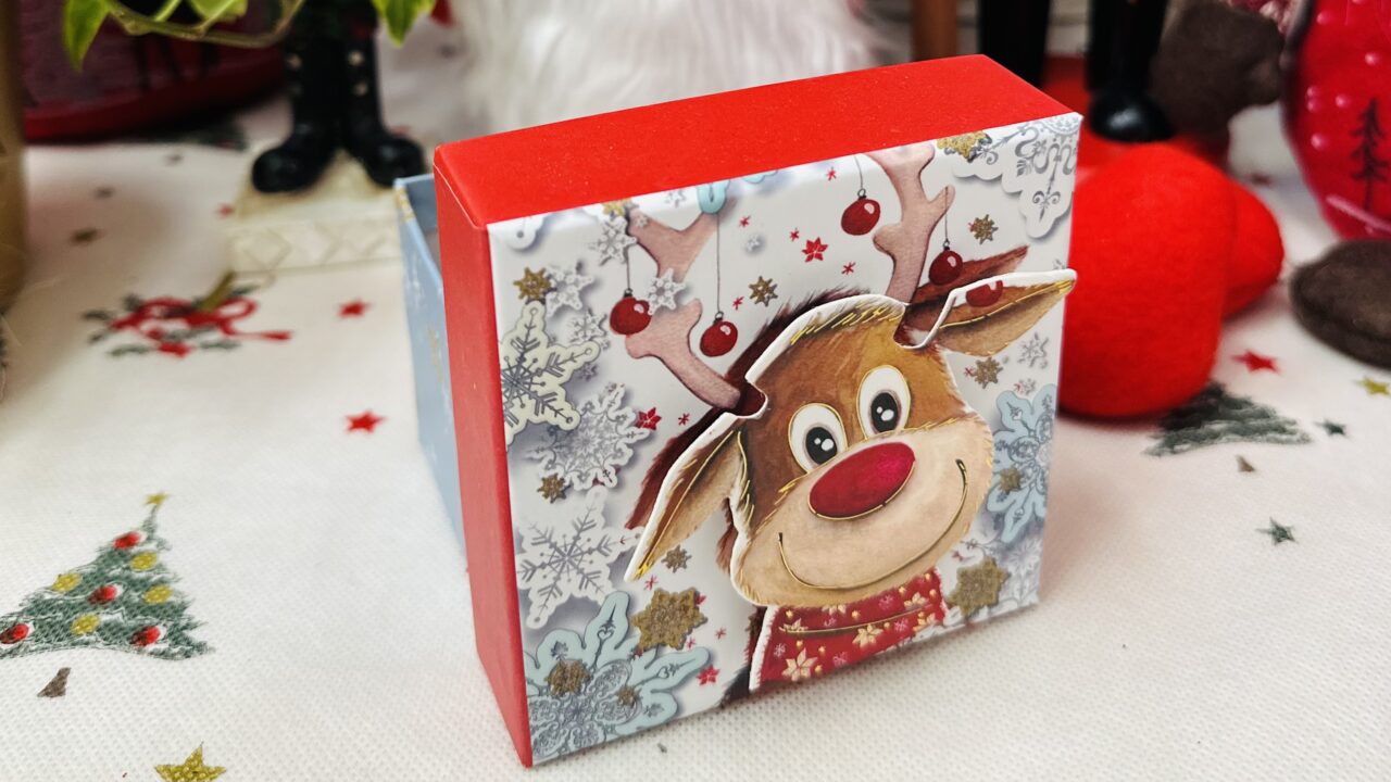 Το κουτάκι έχει διαστάσεις 8,5 x 8,5 εκατοστά και περιέχει ένα μπρελόκ Άι Βασίλη και ένα ξύλινο στολίδι.
