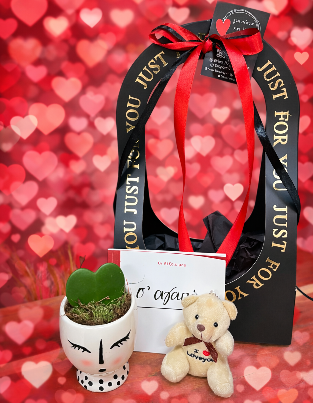 ❤️ Η σύνθεση περιλαμβάνει: • Παχυφυτο σε σχήμα καρδιάς χόγια • Απαλό λούτρινο αρκουδάκι με μήνυμα αγάπης • Ευχετήριο βιβλιαράκι με ρομαντικό μήνυμα • …