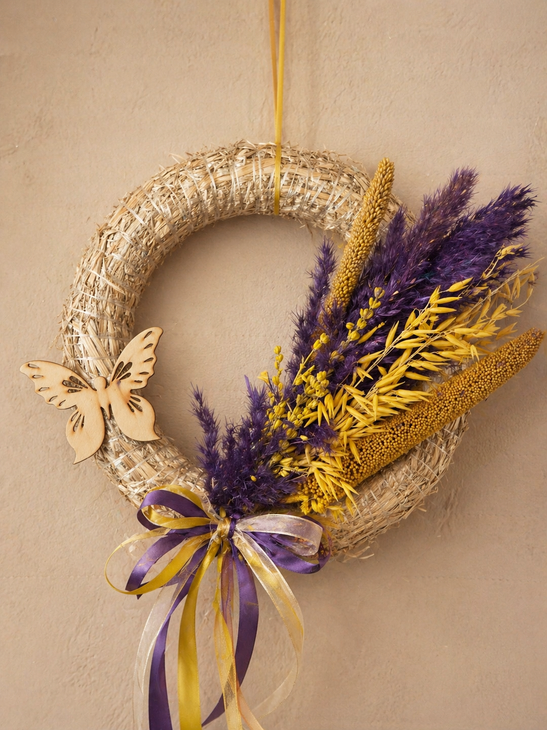 Ένα ξεχωριστό στεφάνι εμπνευσμένο από τη ζωντάνια της άνοιξης, διακοσμημένο με pampas και σιτάρι σε αρμονικές κίτρινες και μωβ αποχρώσεις. Η σύνθεσή του ολοκληρώνεται με ένα ξύλινο διακοσμητικό πεταλούδα, που προσθέτει μια ρομαντική και παιχνιδιάρικη πινελιά.