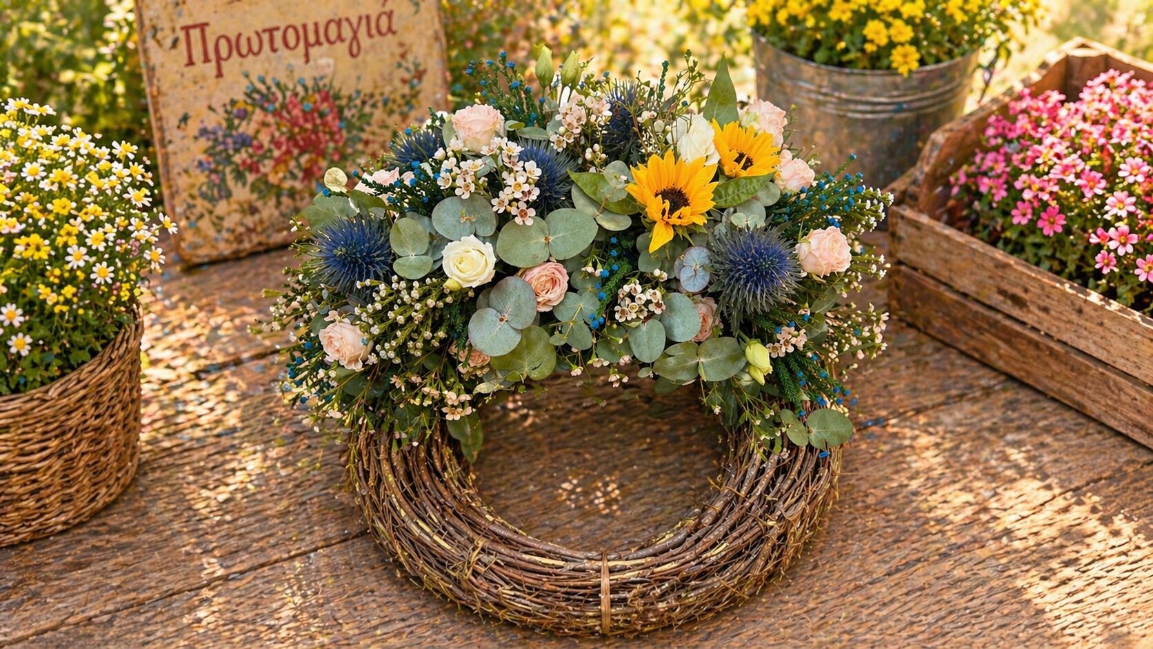 Ιδιαίτερο ξύλινο Πρωτομαγιατικο στεφάνι διακοσμημένο με ήλιους, εριγκνιουμ, τριαντάφυλλο button, βαξ, ευκάλυπτο και μπλε σαφάρι.