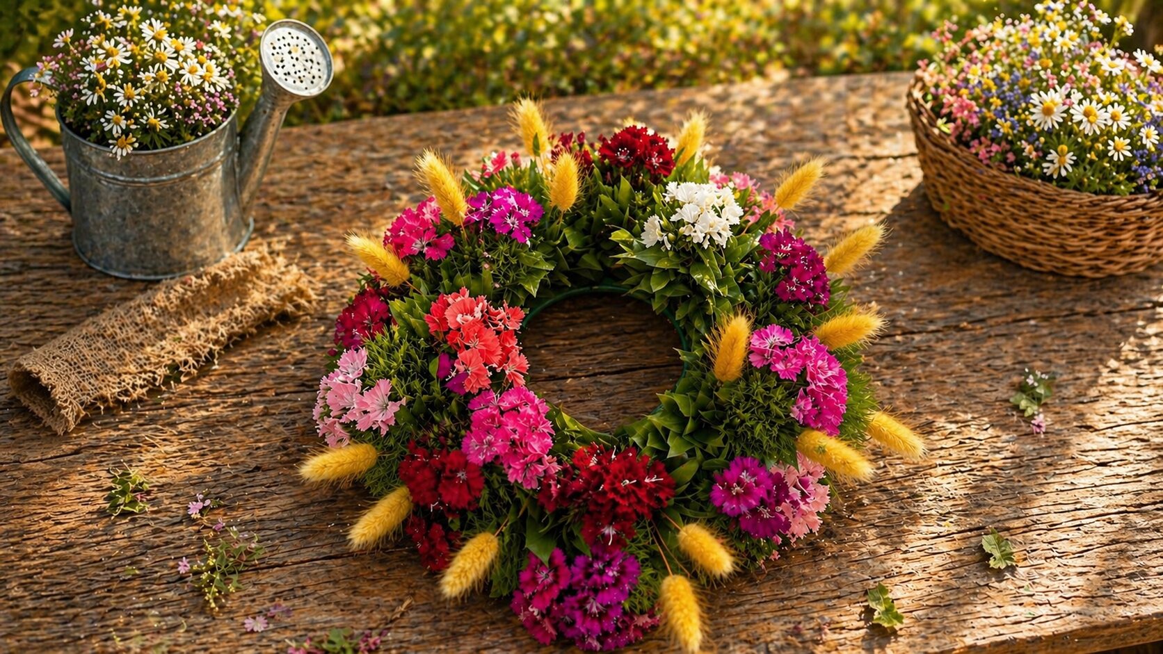 Ιδιαίτερο στεφάνι moss διακοσμημένο με πολύχρωμο κινέζικο γαρύφαλλο και κίτρινα bunny tails. Ιδανικό για να στολίσετε το σπίτι σας αυτή τη Πρωτομαγιά