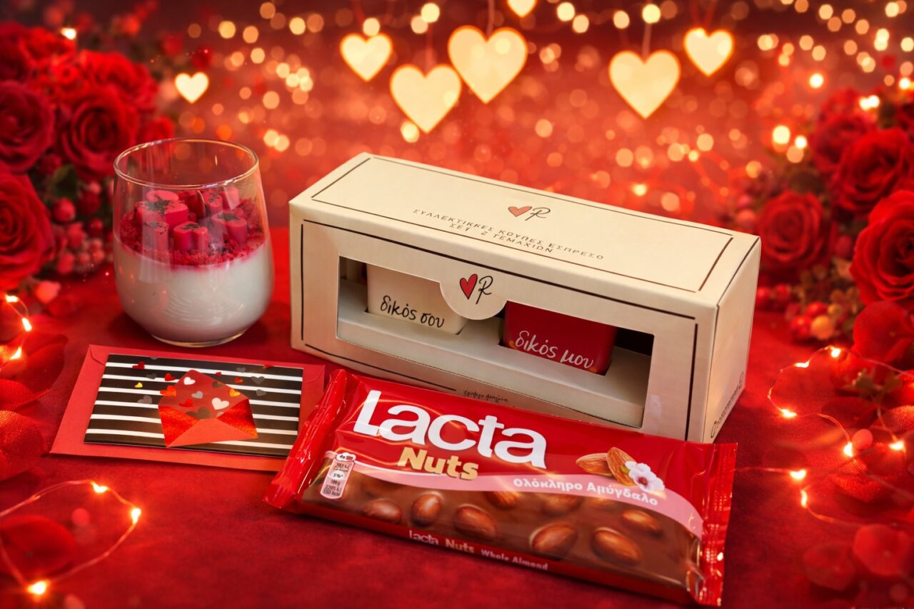 Μίνι κουτί έκπληξη ,περιλαμβάνει κούπες σετ για ζευγάρι «δικός μου» «δικός σου» ,σοκολάτα λακτα ,χειροποίητο κερί σόγιας και κάρτα για ευχές