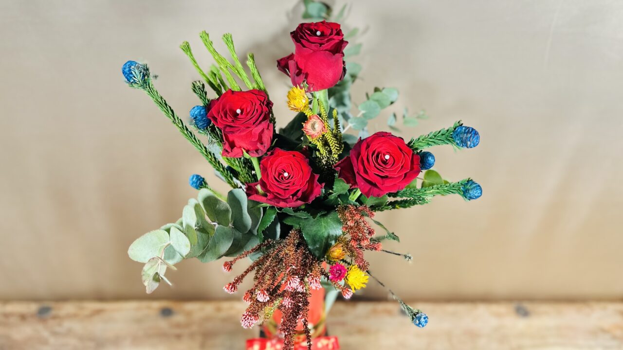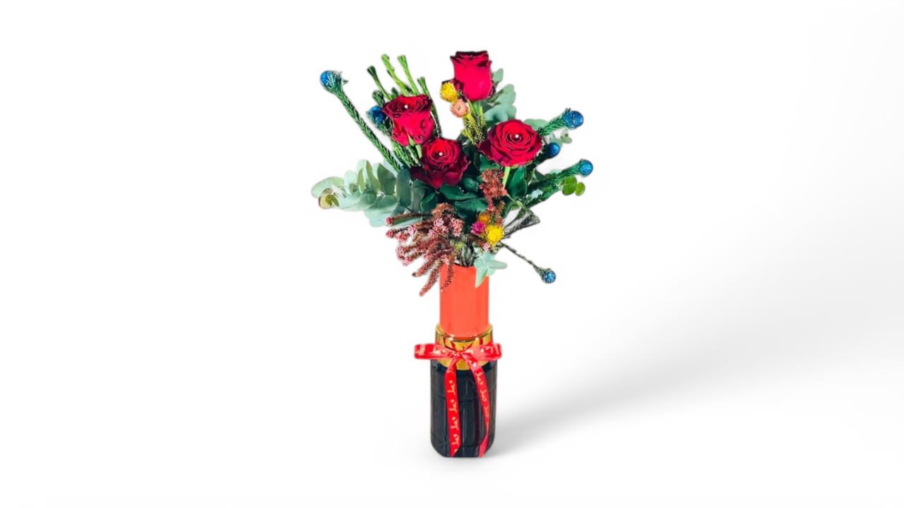 Σύνθεση με αληθινά λουλούδια σε διακοσμητικό βάζο κραγιόν με τριαντάφυλλα, σαφάρι κι ευκάλυπτο