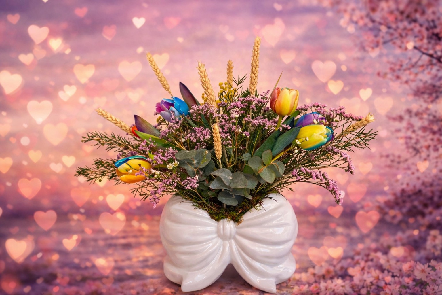 Ιδιαίτερο κασπο σε σχήμα φιόγκου σε λευκή απόχρωση το οποίο περιλαμβάνει σύνθεση με πολύχρωμες τουλίπες, ροζ λεμονιουμ, λευκό vax, ευκάλυπτο και μπεζ στάχυ. Ιδανικό για τους λάτρεις του μοναδικού και του ιδιαίτερου καθώς τραβάει τα βλέμματα σε όποιον χώρο και αν το τοποθετήσετε.