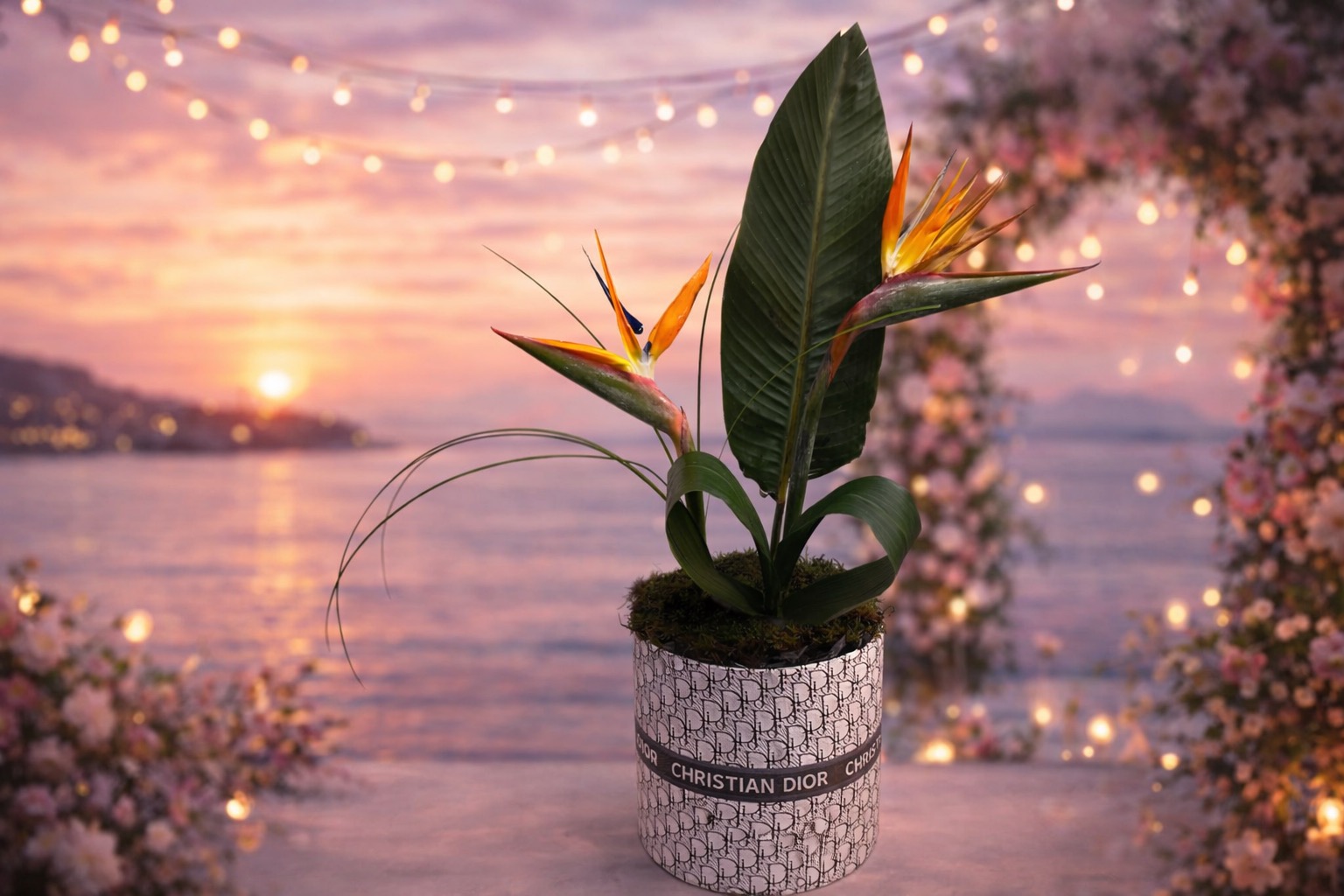 Ιδιαίτερη σύνθεση με Στερλιτσια- Πουλί του παραδείσου και grass σε κουτί Christian Dior. Δώρο που δηλώνει πολυτέλεια, αγάπη και μοναδικότητα.