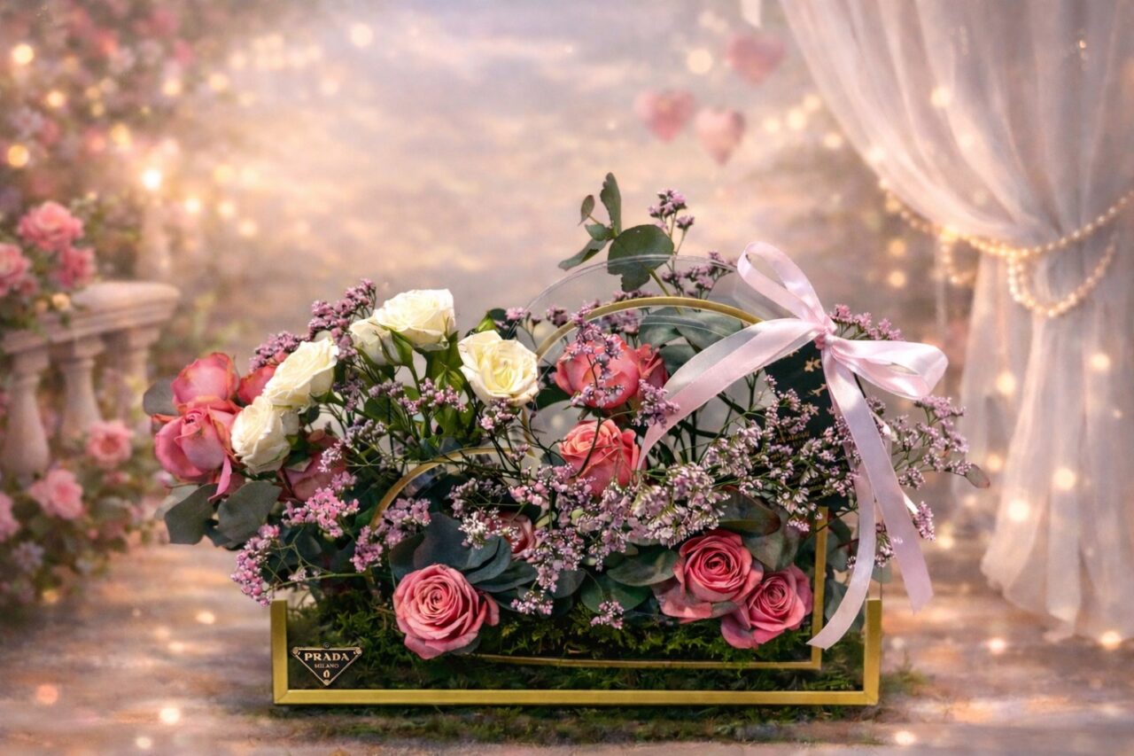 Σύνθεση σε διάφανη τσάντα πλέξιγκλας σε σχήμα καρδιά με χρυσές λεπτομέρειες και χρυσό σήμα PRADA. Περιέχει σύνθεση με button λευκό και ροζ, ευκάλυπτο και ροζ λεμονιουμ. Ιδανικό δώρο για να δείξετε την αγάπη σας καθώς δηλώνει μοναδικότητα και ιδιαιτερότητα.