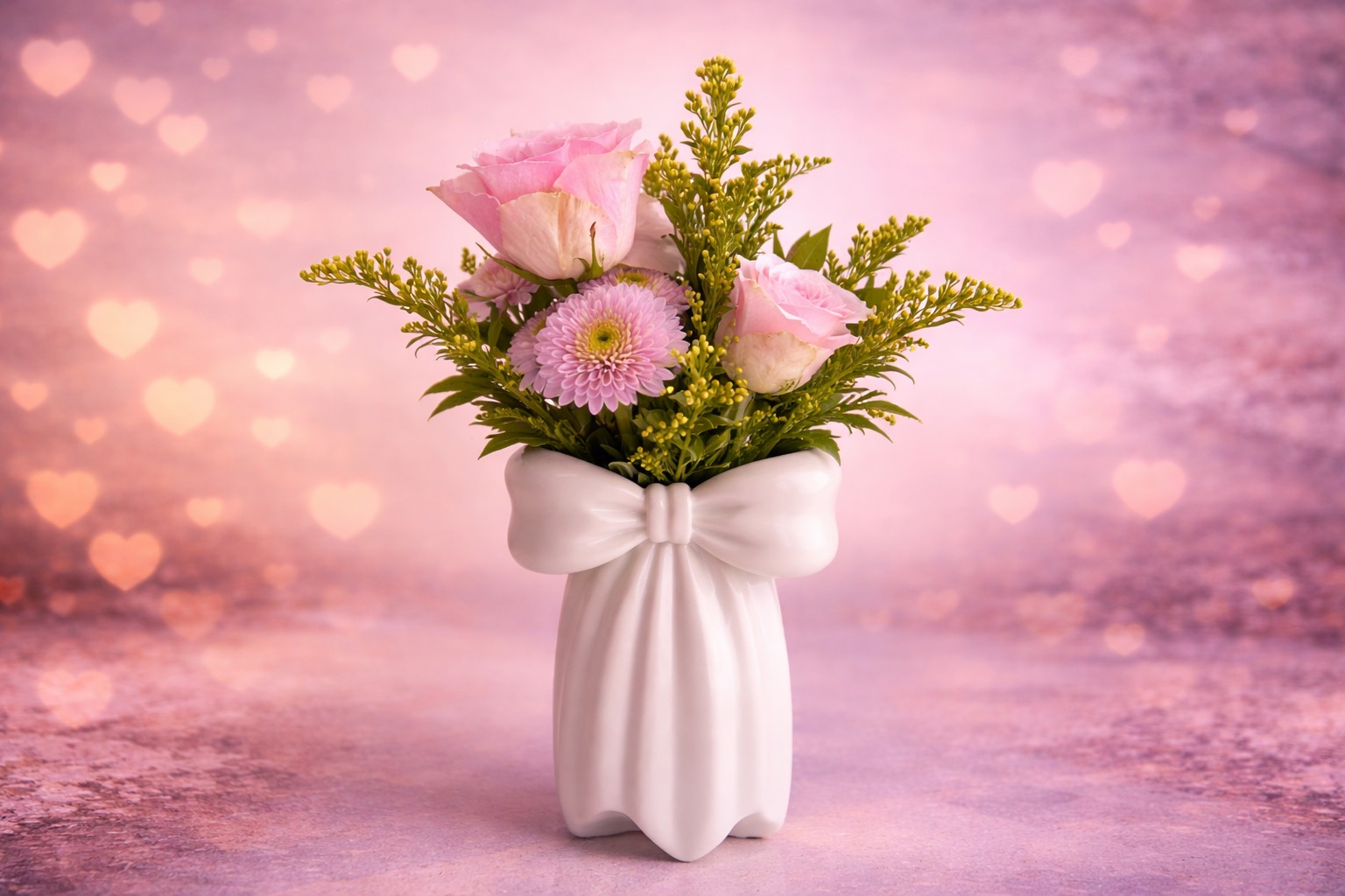 Ιδιαίτερη σύνθεση σε λευκό βαζο σε σχήμα φιόγκου το οποίο περιλαμβάνει ροζ τριαντάφυλλα, ροζ σαντινι και σολινταγκο. Βάζο που φωτίζει το χώρο σας και τραβάει τα βλέμματα.