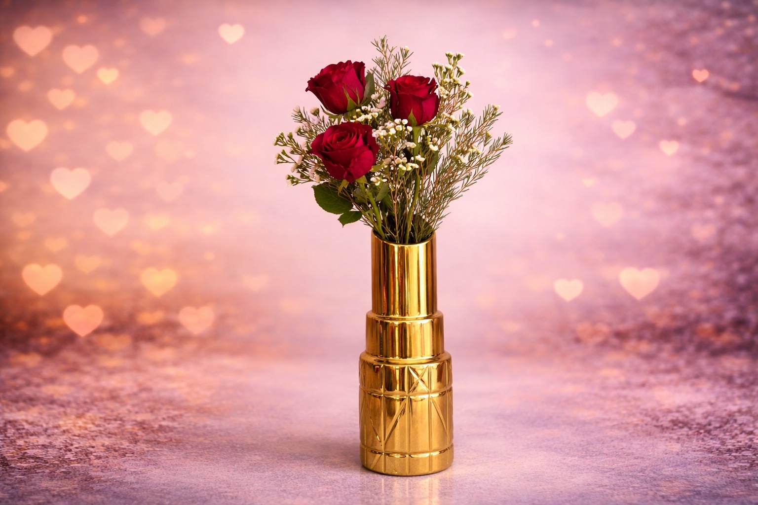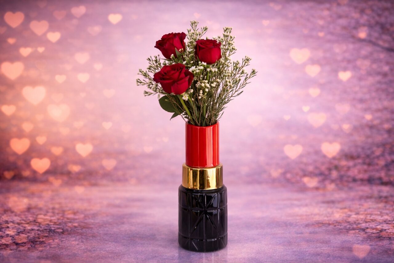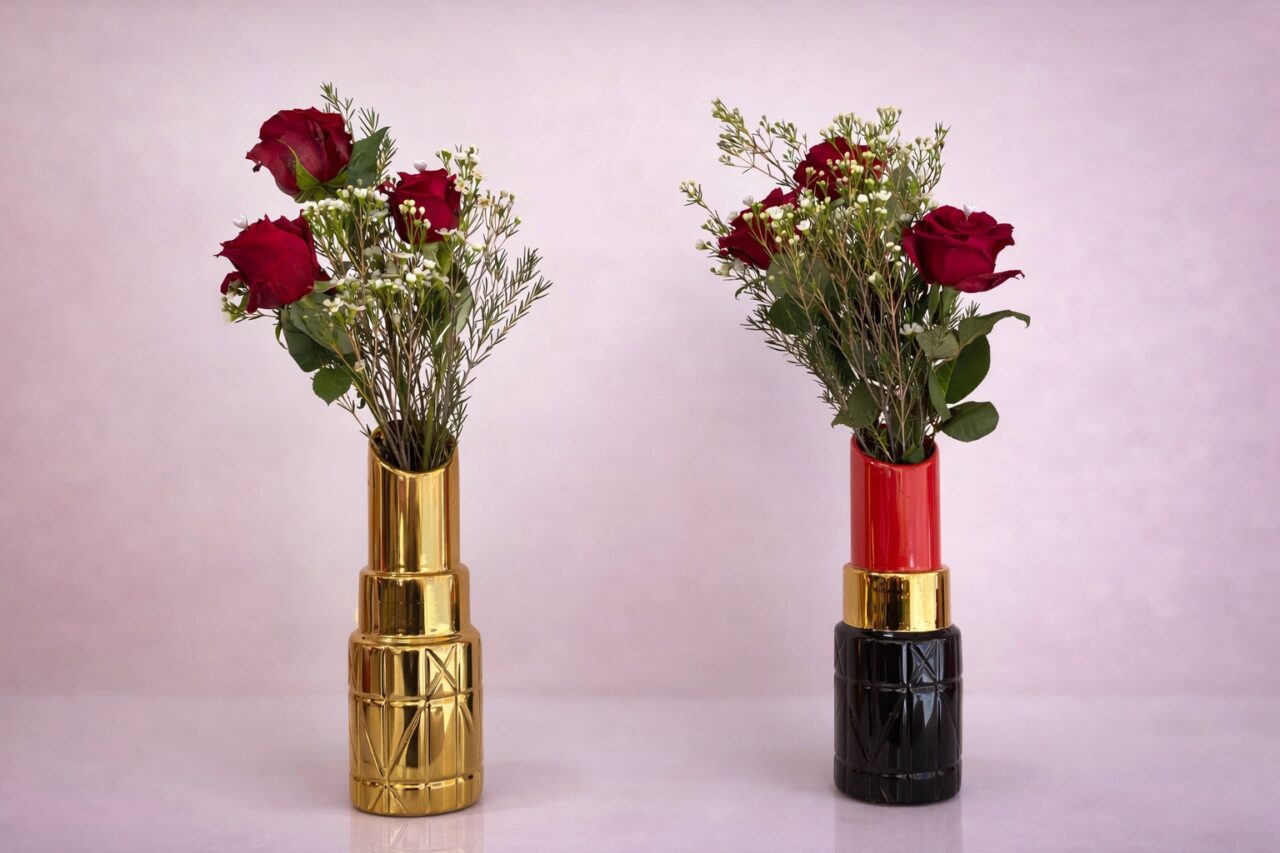 Ιδιαίτερα βάζα σε σχήμα κραγιόν σε δύο χρώματα. Το πρώτο είναι χρυσό ιριδίζον ενώ το δεύτερο αποτελείται από δύο χρώματα κόκκινο και μαύρο. Και τα δύο περιλαμβάνουν σύνθεση με 3 κόκκινα τριαντάφυλλα και vax. Ιδανικά για τους λάτρεις του ιδιαίτερου καθώς προσθέτουν μια μοναδική αίσθηση στο χώρο σας.