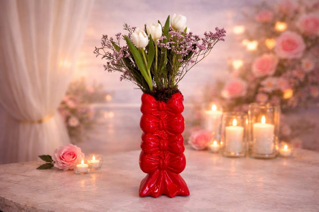 Ιδιαίτερο βάζο σε κόκκινο χρώμα με 4 φιόγκους το οποίο περιέχει λευκές τουλίπες, ροζ λεμονιουμ και λευκό vax. Ιδανικό δώρο που δηλώνει μοναδικότητα και ιδιαιτερότητα καθως θα φωτίσει τον χώρο σας και θα τραβήξει τα βλέμματα.