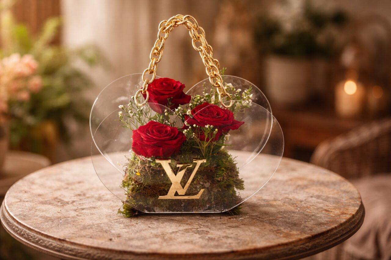 Τσάντα διάφανη πλέξιγκλας σε σχήμα καρδιάς με χρυσό χερούλι αλυσίδα και το σήμα LV (Louis Vuitton) σε χρυσό πλεξιγκλάς που περιέχει κόκκινα τριαντάφυλλα και …