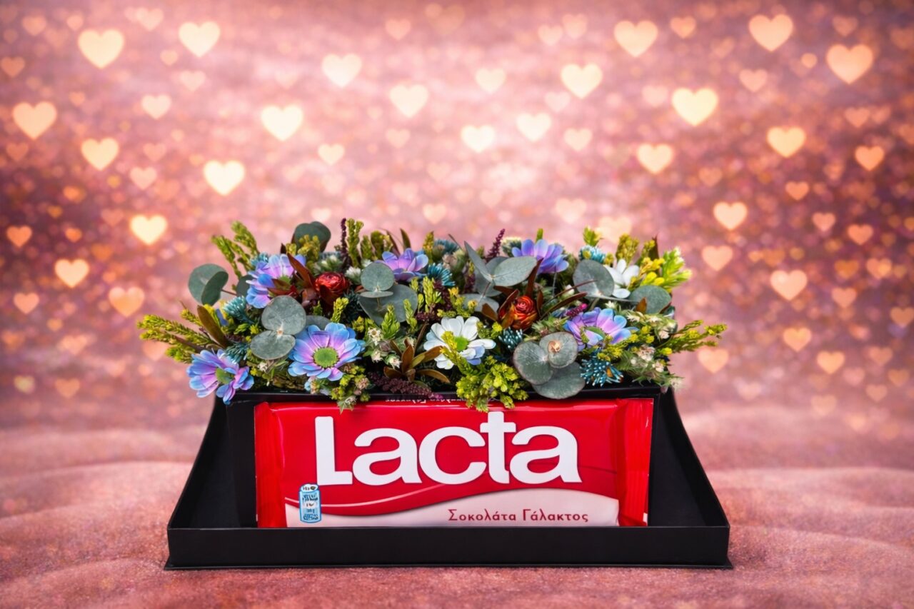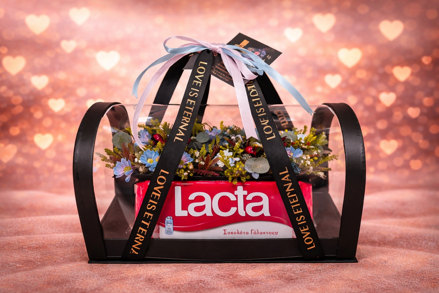 Μοναδική σύνθεση σε τσάντα θερμοκήπιο με σαφάρι, δίχρωμο mini σαντινι και ευκάλυπτο συνοδευόμενο με σοκολάτα γάλακτος λακτα
