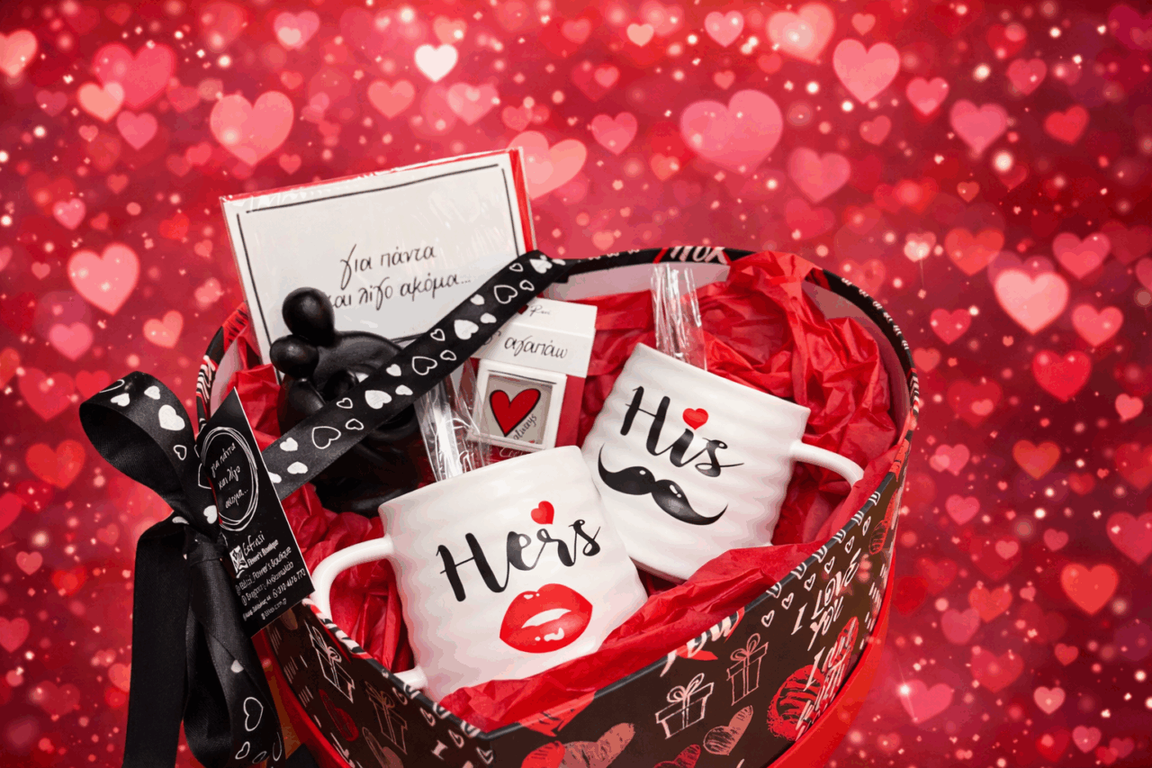 ☕ 2 κεραμικές κούπες His & Hers • 🖤 Διακοσμητικό φιγούρας αγάπης • 💌 Κάρτα με ρομαντικό μήνυμα • 🍫 Γλυκιά λιχουδιά μπισκοτάκια βουτύρου …