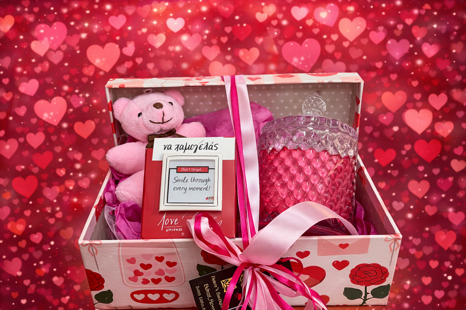 🧸 Λούτρινο αρκουδάκι σε ροζ απόχρωση • 🕯️ Αρωματικό κερί σε γυάλινο δοχείο • 💌 Υπέροχο κουτάκι με μήνυμα μπισκοτάκια βουτύρου από τη συλλογή …