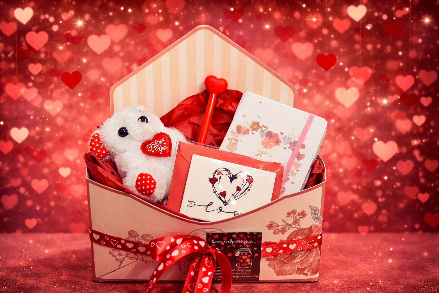 Διακοσμητικό κουτί δώρου σε ροζ αποχρώσεις με ρομαντικό σχέδιο, δεμένο με σατέν κορδέλα • Σημειωματάριο “Happy Love Day”, ιδανικό για σκέψεις, ευχές και προσωπικά …