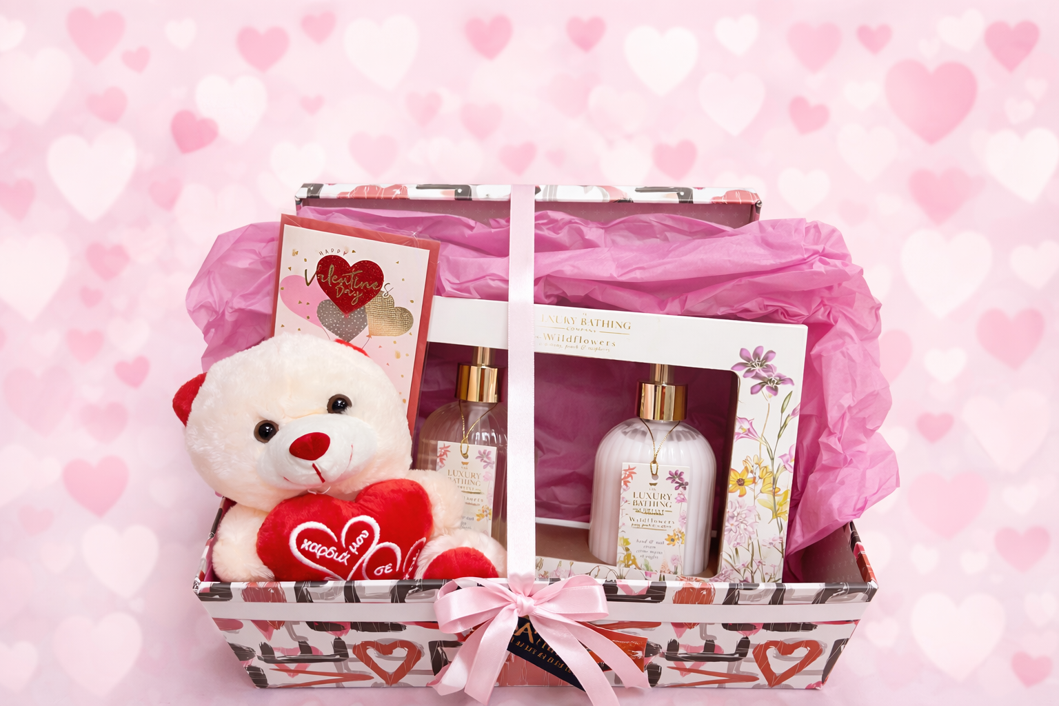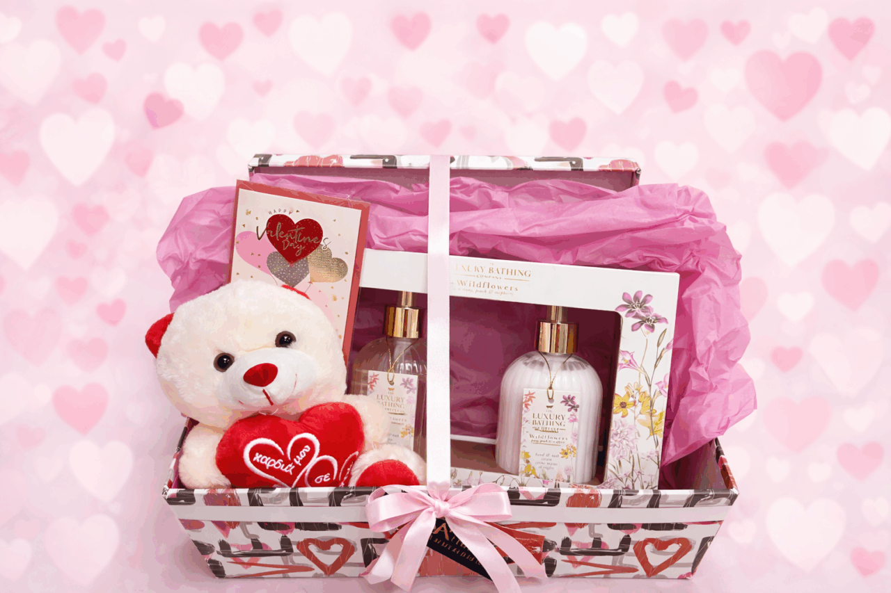 Περιλαμβάνει ένα υπέροχο, ρομαντικό αρκουδάκι 🧸 που αγκαλιάζει την αγάπη, μια κομψή κάρτα για να γράψετε τις πιο γλυκές ευχές σας 🩷 και ένα μοναδικό σετ περιποίησης με σαπούνι χεριών και κρέμα, που χαρίζει αίσθηση πολυτέλειας και φροντίδας 🧁.