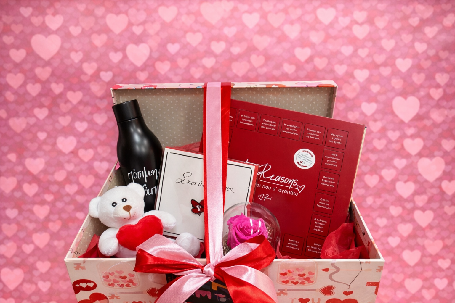 Ένα ρομαντικό και προσεγμένο κουτί δώρου, σχεδιασμένο για να εκφράσει την αγάπη με λόγια και συναίσθημα. Το gift box περιλαμβάνει θερμός/μπουκάλι με μήνυμα, σοκολατάκια από τη συλλογή της ΡΕΝΕ “Reasons που σ’ αγαπώ” για προσωπικές αφιερώσεις, διατηρημένο αιώνιο τριαντάφυλλο σε γυάλινη καμπάνα, λούτρινο αρκουδάκι με καρδιά και κάρτα αγάπης. Όλα δεμένα σε βαλεντίνικη συσκευασία με σατέν κορδέλα.