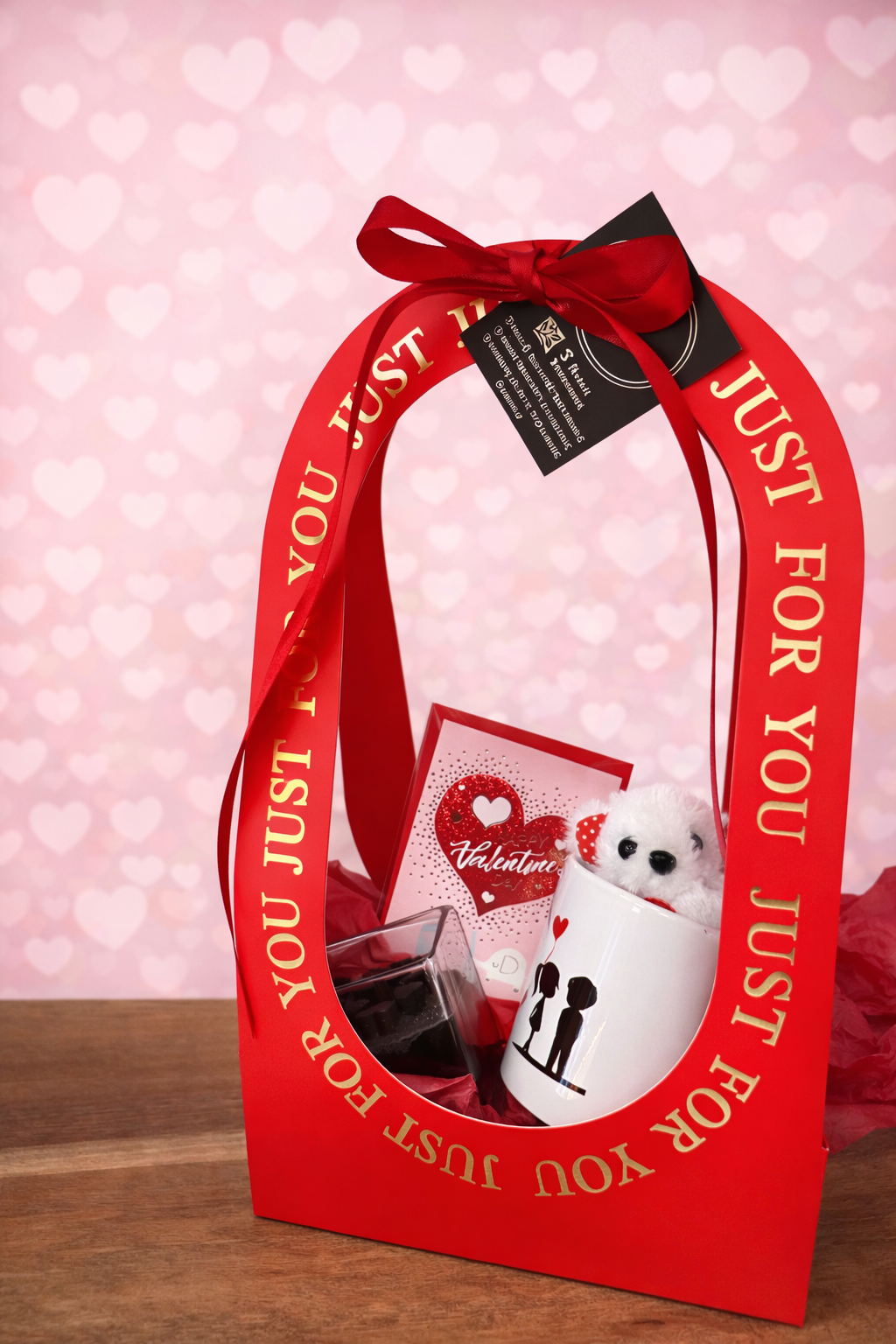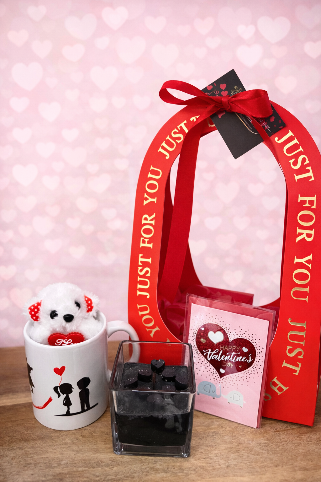 Η ρομαντική κούπα με το αρκουδάκι, το κερί με καρδιές και η βαλεντίνικη κάρτα δημιουργούν μια γλυκιά ατμόσφαιρα, ιδανική για να πεις «σ’ αγαπώ» με απλότητα και φροντίδα.